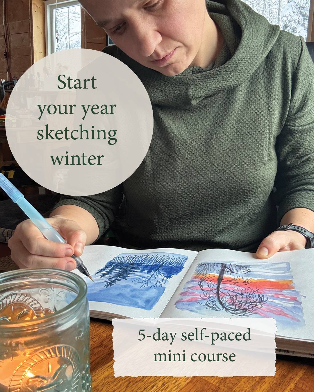 A 5-day self-paced mini-course for nature lovers and sketchers who want approachable, guided prompts to capture winter landscapes and trees. Each day includes a PDF with warm-ups, step-by-step exercises in pencil, pen, and watercolor, and nature journaling prompts to help you observe textures, form, and winter light. Work at your own pace, explore layering and value, and connect with the natural world. No experience required.